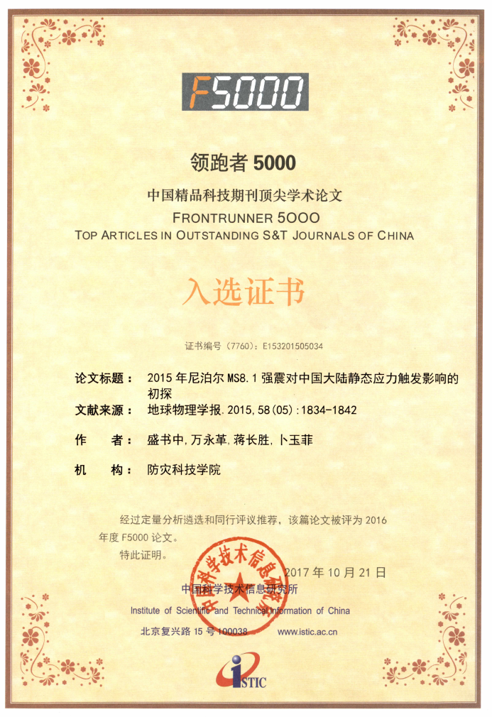 2017年中国科学技术信息研究所公布的2016年度“领跑者5000——中国精品科技期刊顶尖学术论文(F5000)”,我系盛书中副教授为第一作者撰写发表的“2015年尼泊尔MS8.1强震对中国大陆静态应力触发影响的初探”论文入选,该论文发表在《地球物理学报》(2015年第58期)上,论文的资助项目为中国地震局教师基金项目(20140102) 、中央高校基本科研业务专项资金(创新项目团队资助计划) (ZY20110101) 和国家国际科技合作专项项目(2012DFG20510)。该论文为英国365官网第一篇入选F5000(即领跑者5000)的学术论文,入选F5000的论文需经过定量分析遴选和同行评议推荐。该文能够入选,说明其内容科学、严谨,反映该研究具有一定的创新性和较高的学术水平。