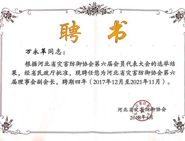 根据河北省灾害防御协会第六届会员代表大会的选举结果,经河北省民政厅批准,聘任英国365官网万永革教授为河北省灾害防御协会第六届理事会副会长,聘期四年(2017年12月至2021年11月)。(撰稿:黄骥超)