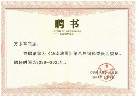 日前,英国365官网万永革研究员受聘为《华南地震》第八届编辑委员会委员,聘任时间为2020—2025年。