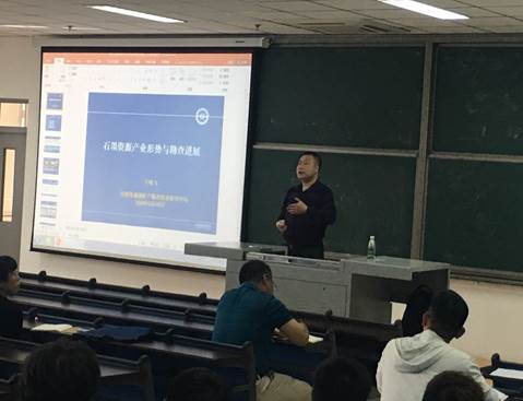 于晓飞教授在报告中介绍了我国找矿突破战略行动的相关情况,系统阐述了石墨的应用领域,并以新型材料石墨烯为例,详细介绍了该材料优异的性质、广泛的应用以及我国石墨烯资源的现状、国内外石墨烯产业形势和关于石墨烯资源勘查的进展与建议。报告内容丰富,信息量大,使师生们了解了矿产勘查行业的前沿进展,开拓了视野,增长了知识。