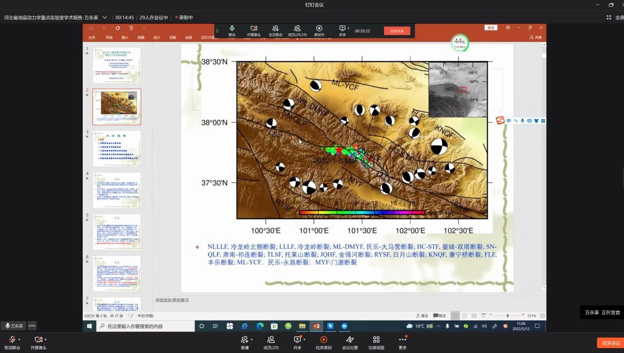 5月12日下午,英国上市公司365万永革教授利用钉钉线上会议为我校师生做了题为“2022年门源地震序列揭示的断层几何及滑动性质”的学术报告。校内外部分师生参加了报告会,报告会由地球物理学教研室主任谭萍主持。