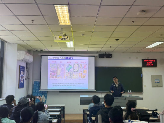 张亮亮从地球化学领域中应用原位微区分析技术与原理、LA-ICP-MS原位微区分析技术的原理及应用范围、矿物U-Pb定年体系及地球科学应用、LA-ICP-MS技术前沿等几个方面,详细介绍了LA-ICP-MS分析技术及中国地质大学(北京)科学研究院矿物激光微区分析实验室(Milma Lab)创新性研究成果,为在场师生带来了一场学术盛宴。同时,作为中国地质大学(北京)科学研究院招生宣传的重要一站,张亮亮为学校师生介绍了中国地质大学(北京)科学研究院的卓越导师团队、实验技术分析平台和研究生培养机制等,并鼓励大家积极报考科学研究院。